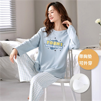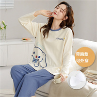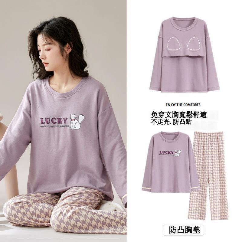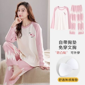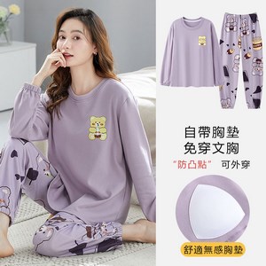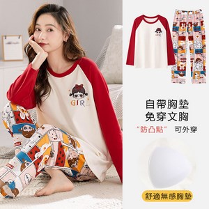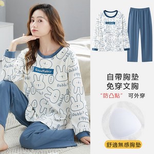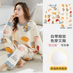 新款純棉長袖睡衣女士春秋款帶胸墊防凸點家居服女寬鬆大碼