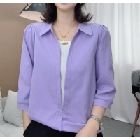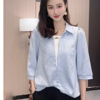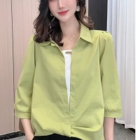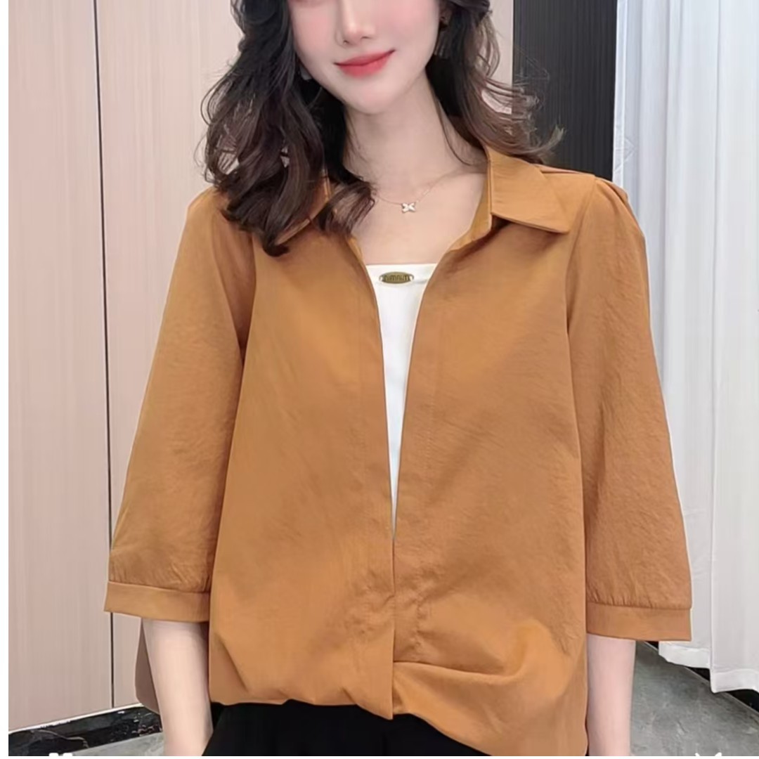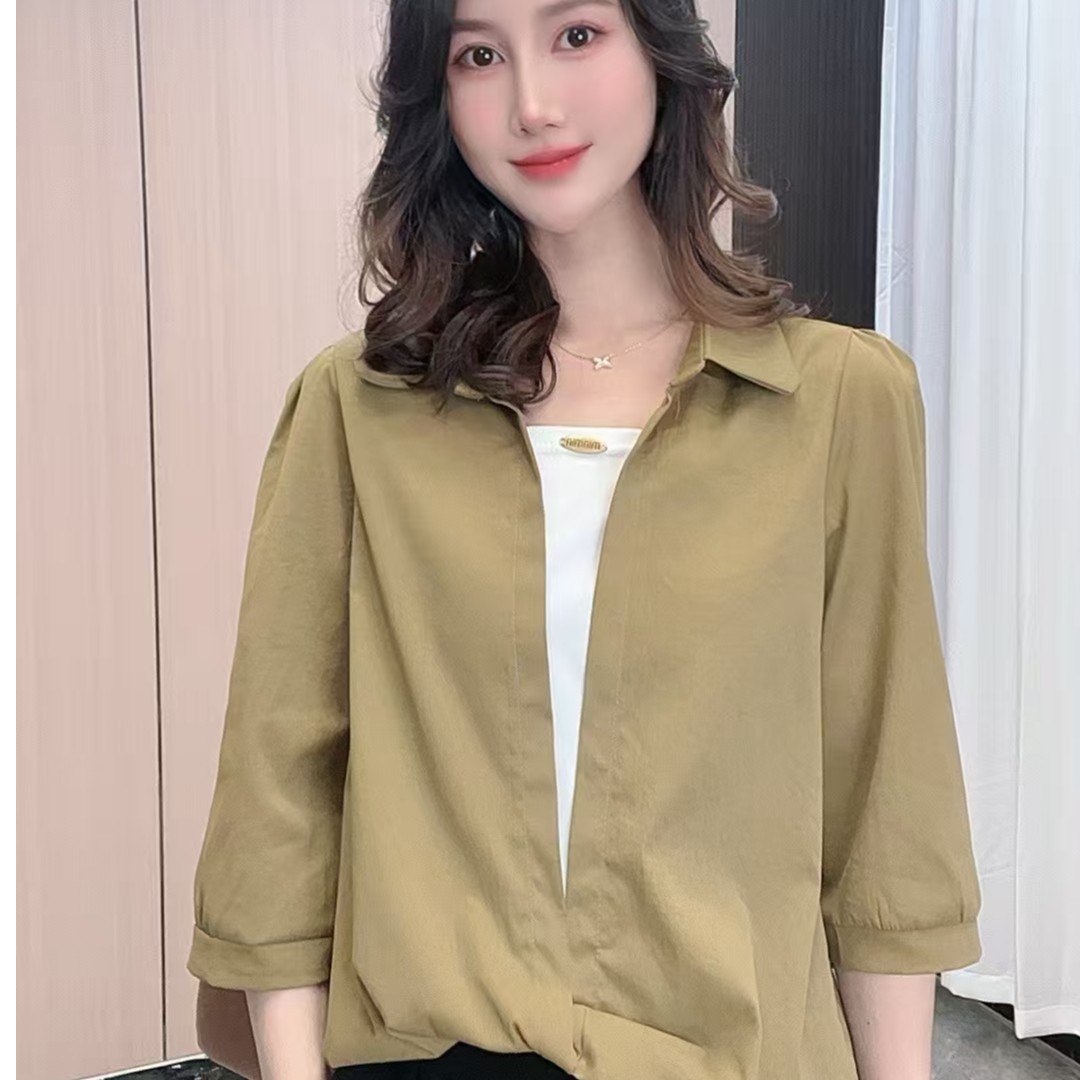 2025新款翻領 七分袖假兩件襯衫 透氣冰絲垂感面料 減齡顯瘦 時尚洋氣襯衣